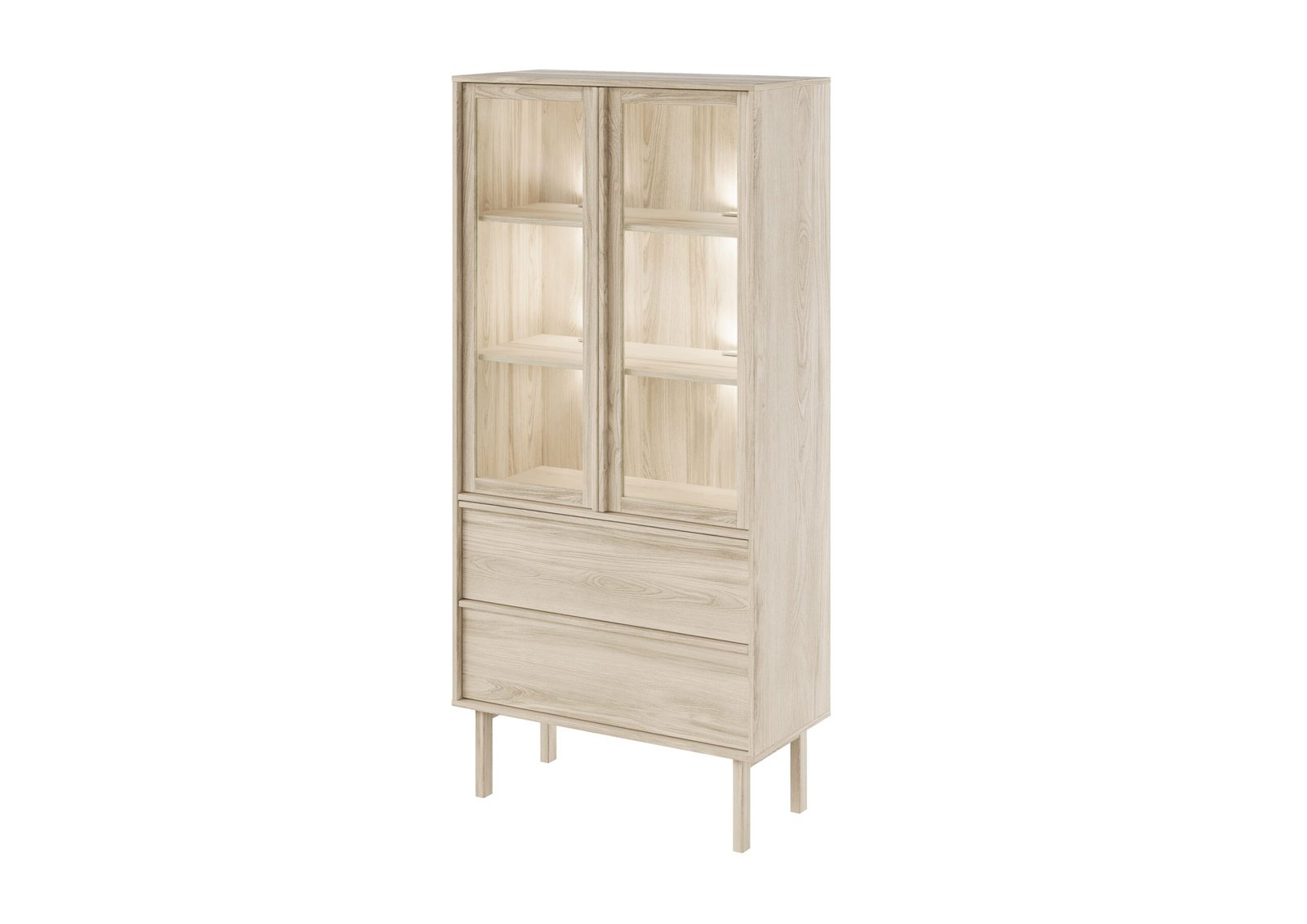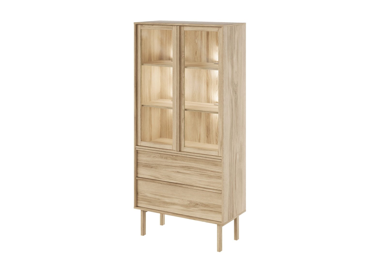 Indauja su 2 stalčiais ir dviems durelėmis su stiklu ant medinių kojų.