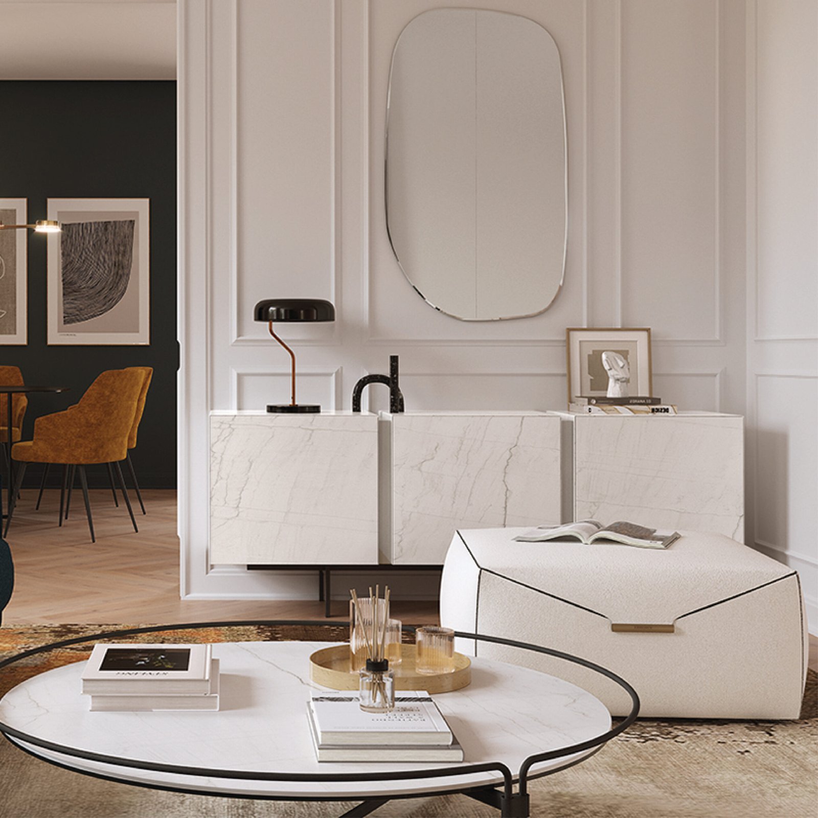 Viršutinis modulis: Korpusas gali būti prabangiai lakuotas arba dengtas aukščiausios kokybės keramika, kurią lengva derinti prie „Dressy“ valgomojo stalų.