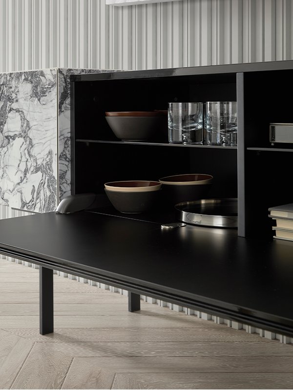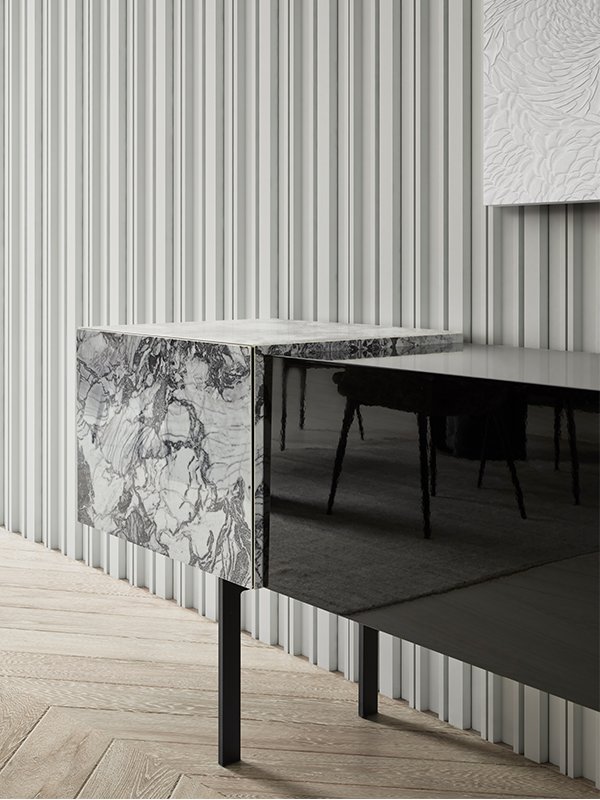 Viršutinis modulis: Korpusas gali būti prabangiai lakuotas arba dengtas aukščiausios kokybės keramika, kurią lengva derinti prie „Dressy“ valgomojo stalų.