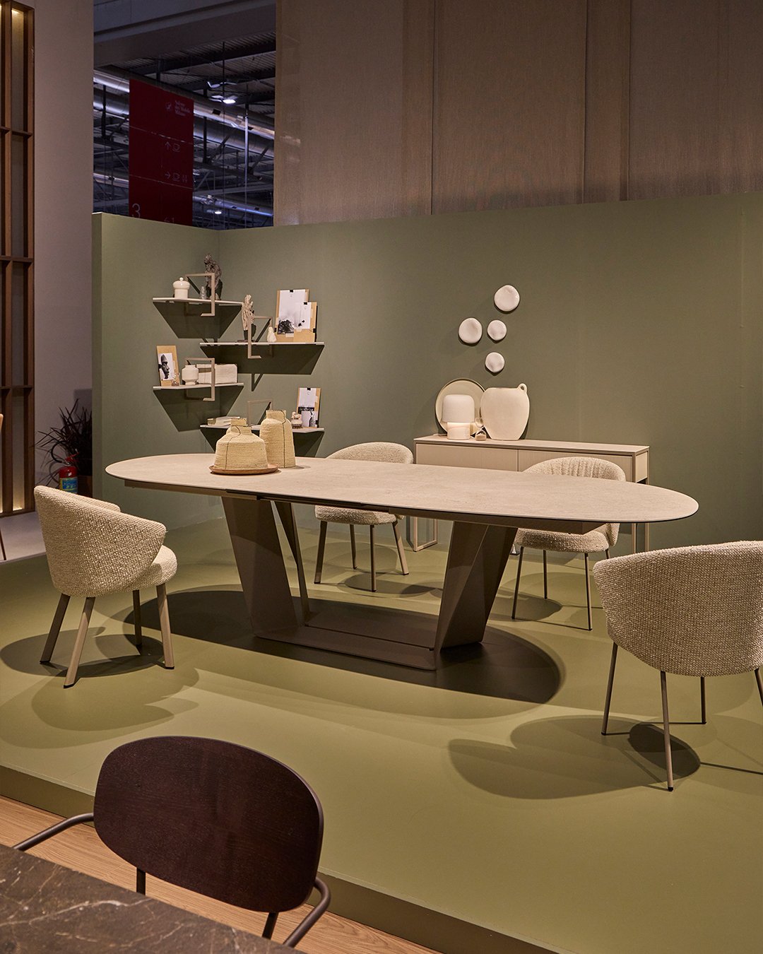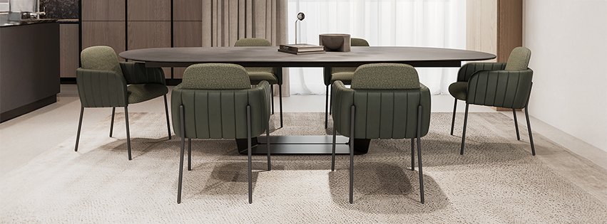Pagrindinis šios kolekcijos akcentas – unikali bazė. Stalo kojos ir rėmas suprojektuoti naudojant inovatyvų 8 mm storio lankstytą plieną.